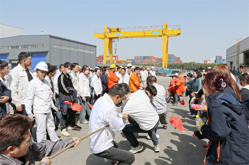 隨著比賽的哨聲響起,參賽隊(duì)員們口中一齊高呼著“一二,一二”,雙手緊握長繩,憋足了勁拼命往后拉。比賽過程中,隊(duì)員們努力拼搏,無論是場上還是場下,氣氛都異常緊張,富有節(jié)奏的吶喊聲、加油聲,充斥在賽場上空。尤其是在勝負(fù)難分的時(shí)刻,雙方隊(duì)伍毫不退卻,咬緊牙關(guān),堅(jiān)持到底。賽場上的隊(duì)員個(gè)個(gè)斗志昂揚(yáng),用他們的汗水為我們詮釋了團(tuán)結(jié)的含義,他們頑強(qiáng)的毅力與拼搏的精神讓每一個(gè)人感動(dòng)?,F(xiàn)場加油助威的員工個(gè)個(gè)熱情高漲,吶喊助威給比賽增添了一抹亮色。